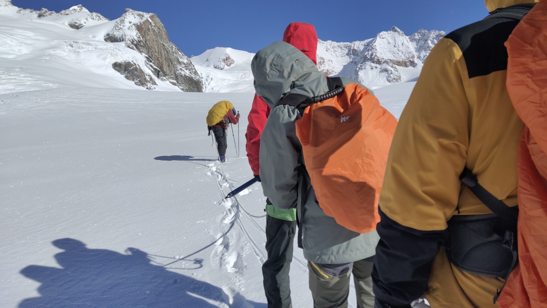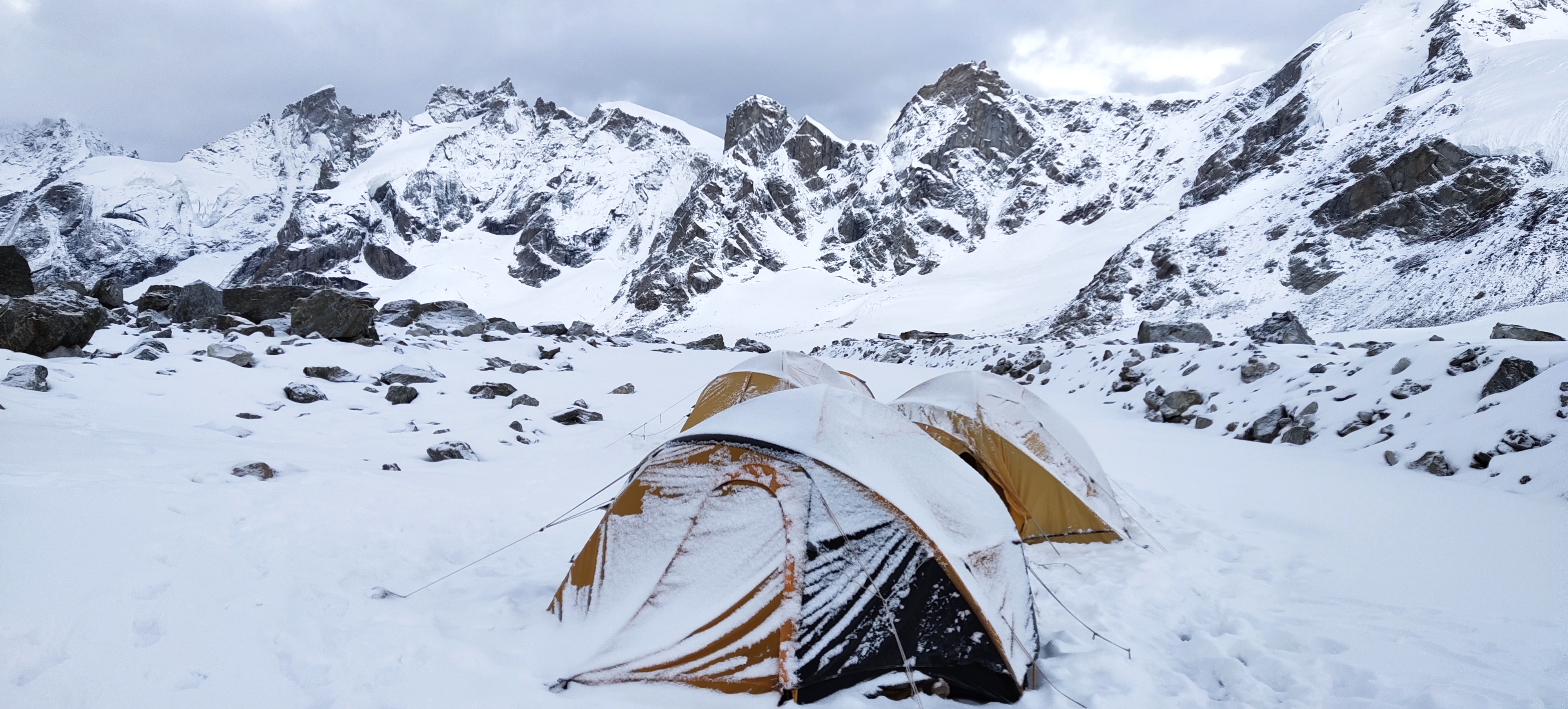 On our third day on the glacier, we were engulfed by a complete whiteout which made navigating the glacier and approaching the pass a difficult and dangerous proposition. So, we pitched camp at noon, a few hundred metres below the top, while the snow continued to come down on us. With the third night on the glacier upon us and with no sign of the weather letting up, our guests’ fear and paranoia really came to the fore. As a team we had to face the barrage of questions that came our way with a smile and reassure them that all we needed is the smallest weather window to get us through. Having a satellite phone at our disposal helped in keeping relevant people updated about our safety and location, however, no external help could reach us in those conditions. We explained this to everyone, while adding that all the help they needed was accompanying them on the trek.